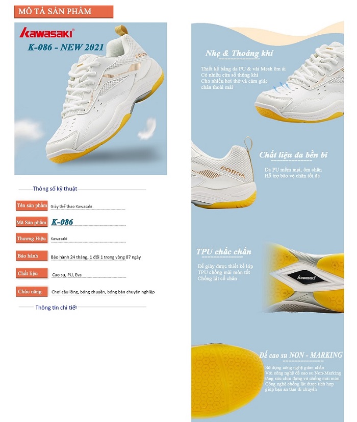 - Giày Kawasaki là dòng giày thiết kế chuyên dụng dành cho môn thể thao Cầu lông với các tiêu tuẩn chất lượng cao.