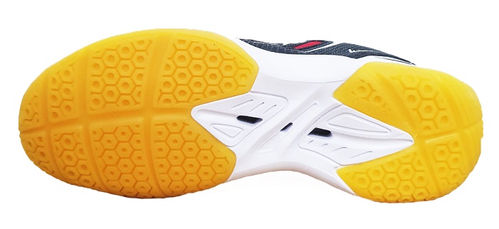 - Đế giày thiết kế 2 lớp đế kép, cao su non chống sự mài mòn cao, các rãnh hình tổ ong mang lại độ bán sân tốt hơn và ổn định hơn khi bật nhảy.