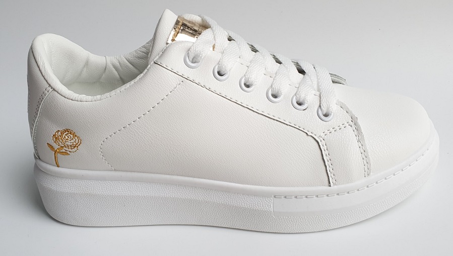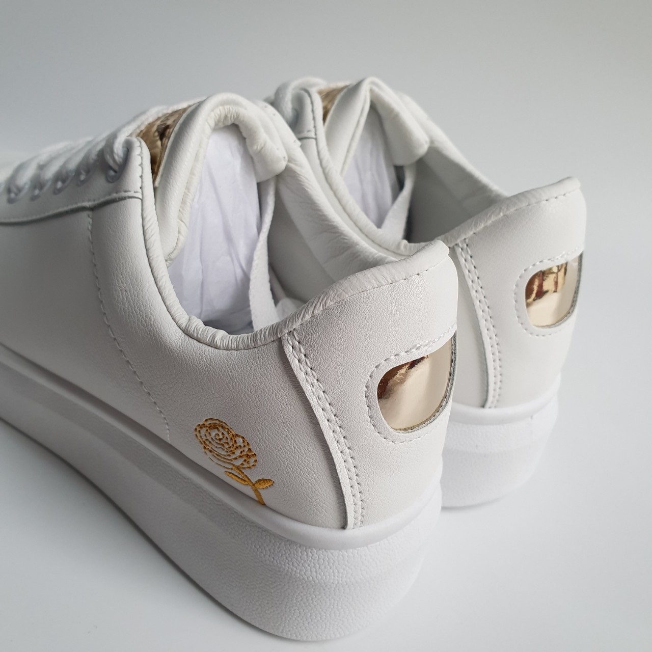 - Thân giày màu trắng với điểm nhấn ở phần gót tạo cho đôi giày nổi bất hơn, Toàn bộ thân giày được làm bằng chất liệu da PU cao cấp mềm mịn và độ bền cao, đường may chắc chắn và tỉ mỉ.