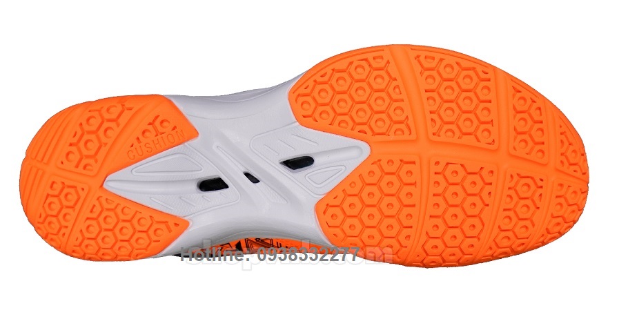 - Đế giày thiết kế 2 lớp đế kép, cao su non chống sự mài mòn cao, các rãnh hình tổ ong mang lại độ bán sân tốt hơn và ổn định hơn khi bật nhảy.