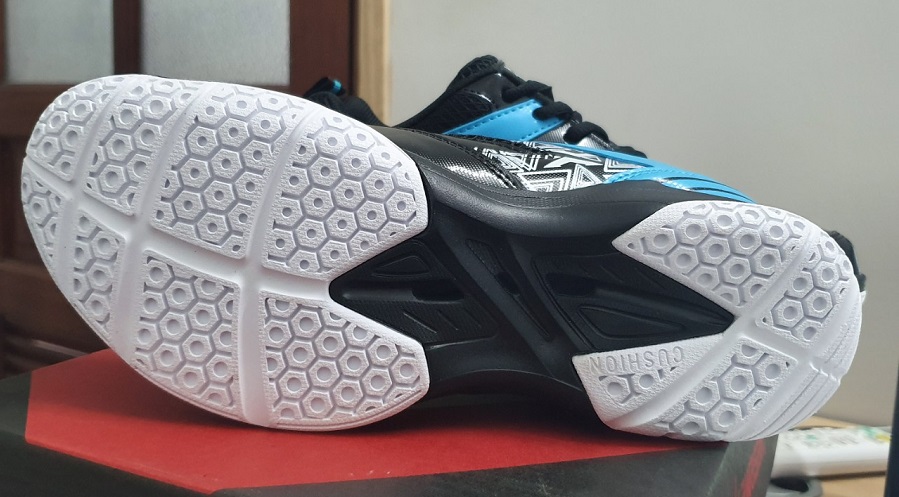 - Đế giày thiết kế 2 lớp đế kép, cao su non chống sự mài mòn cao, các rãnh hình tổ ong mang lại độ bán sân tốt hơn và ổn định hơn khi bật nhảy.
